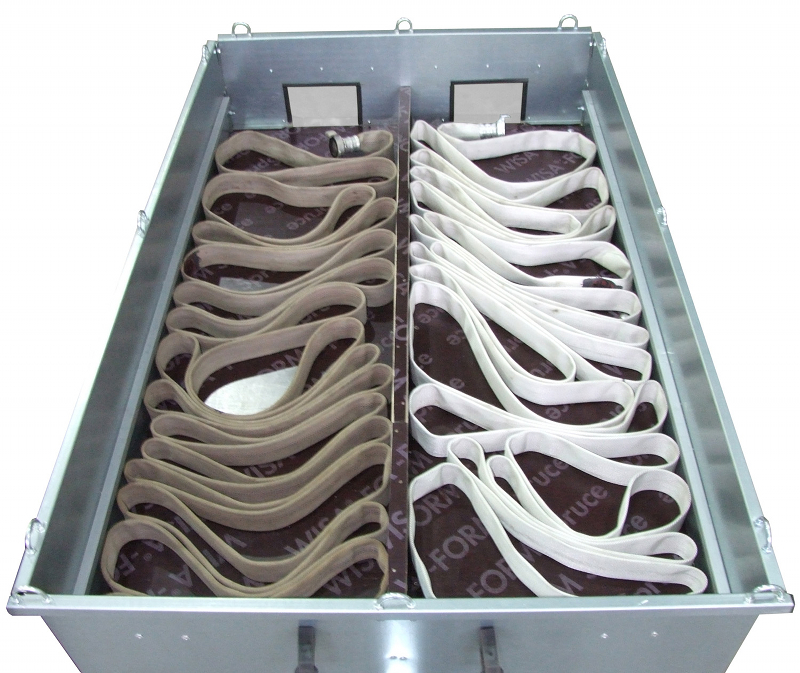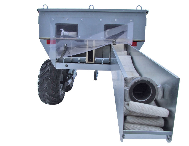 Dans la coque inférieure, 4 compartiments amovibles logent 300m de tuyaux diamètre 76mm (3")